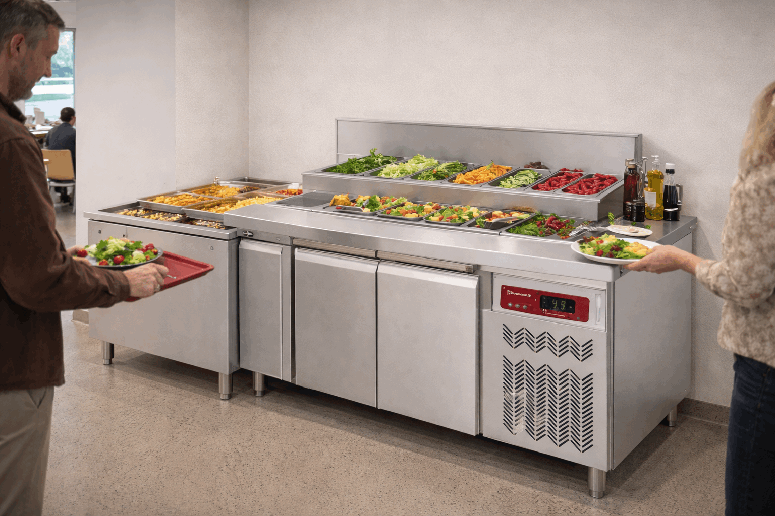 Med en dedikert salatkjølebenk eller kjølt garnityrrenne får du optimal lagring gjennom ventilert kjøling og automatisk temperaturkontroller. Dette gir en jevn og trygg temperatur, selv når det går hett for seg på kjøkkenet. En modell med heldekkende rustfritt lokk – som Salatkjølebenk med garnityrrenne og 3 dører – sørger for at garnityret holdes friskt og beskyttet både før, under og etter servering. Har du vurdert hvor mye et lokk kan redusere bakterievekst og gjøre renholdet enklere?