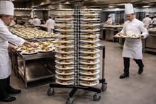 I bankettkjøkken handler det om kontroll. Rettene må anrettes på forhånd og stå klart til servering uten at kvaliteten forringes. Tallerkenstativet gjør det mulig å bygge høyde i stedet for å oppta verdifull benkeplass. På den måten kan kokken dandere tallerken etter tallerken på et konsentrert område, samtidig som logistikken rundt servering forenkles.