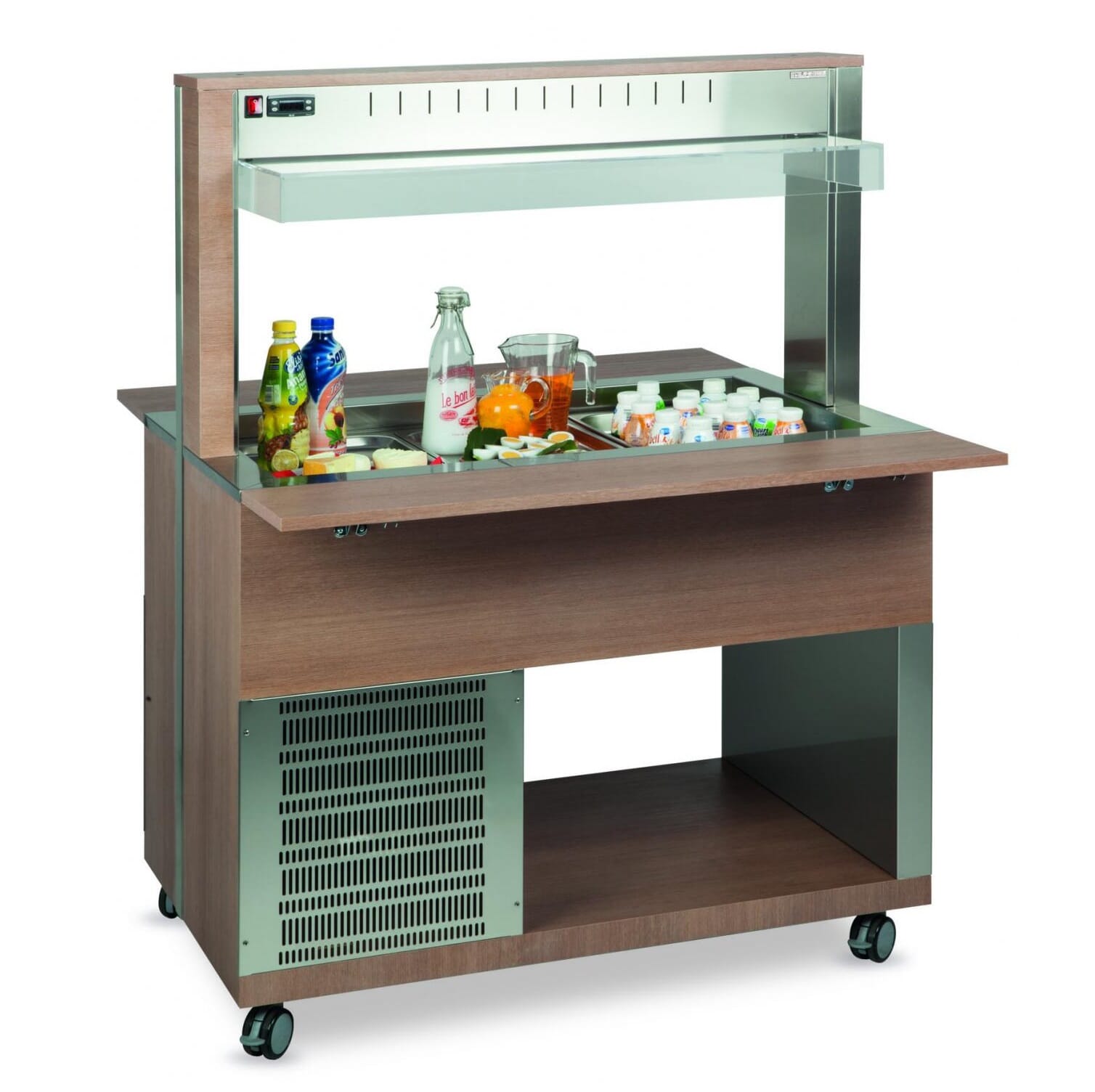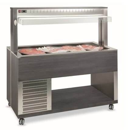 Mobil kjølt buffet / salatbuffet, med kjølebrønn i rustfritt stål. Statisk kjøling i kjølebrønn.