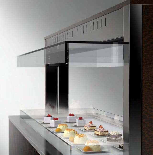 The ventilation grids of the compressor unit are cut directly into the wooden structure for elegant visual continuity.