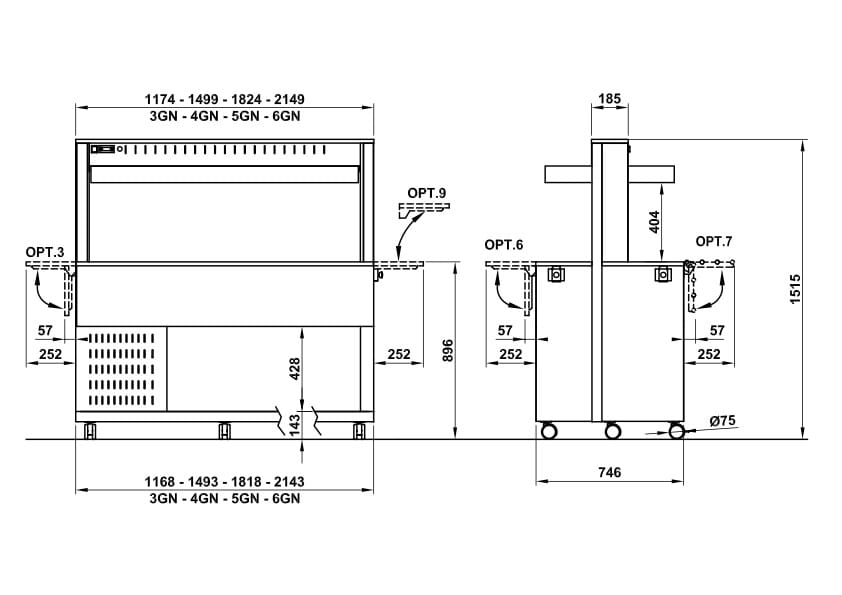 Varm buffet med vannbad og halogenlamper. 6/1-GN. Mål: 2149x746x1515mm.