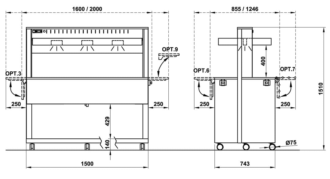 Tilpasset 4x 1/1-GN. Mål: 1600x743xh1510 mm.