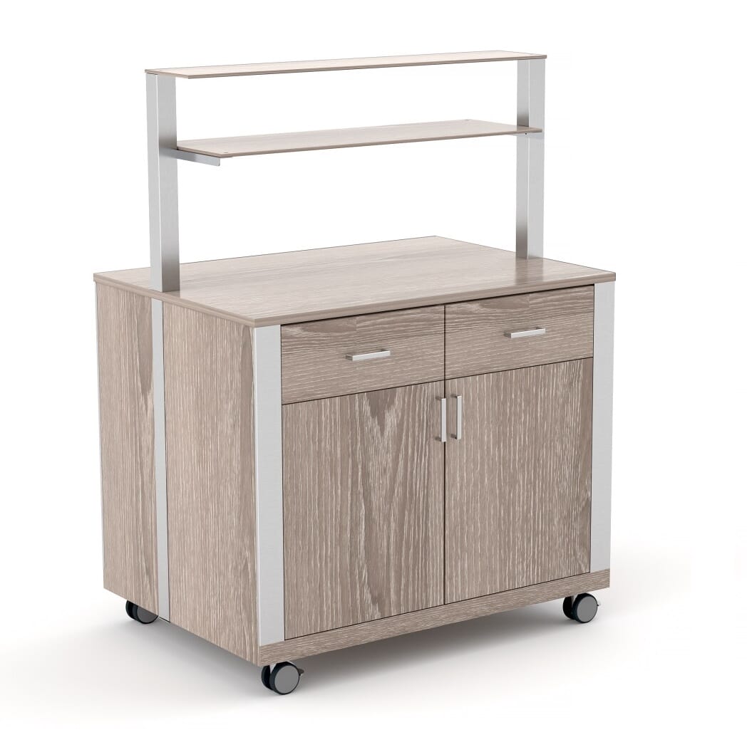 Overbygg med hyller og underdel med to skuffer og to dører. Regulerbare hyller innvendig. Rustfri topplate.