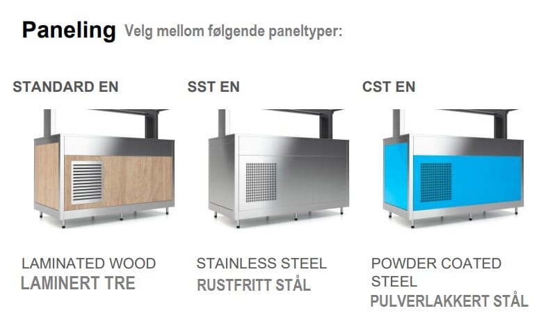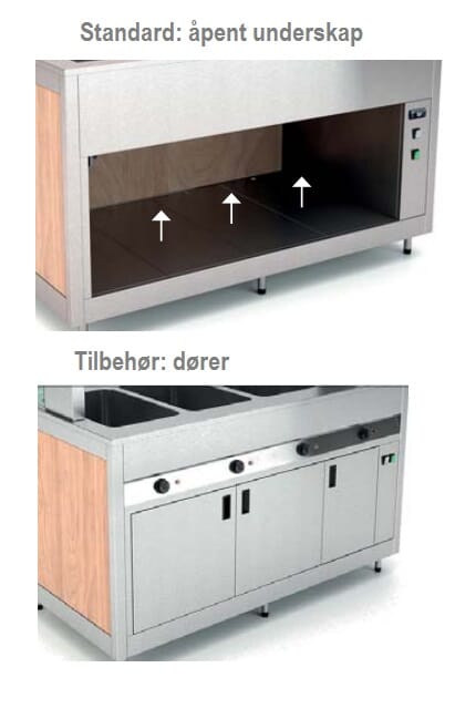 Ventilert kjøling: I de siste årene har vi også kunne tilby ventilert kjøling. Dette fungerer slik at den kalde luften kommer ut i spalter/ventiler rett i overkant av GN-bakkene (kantinene).