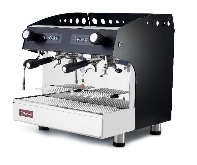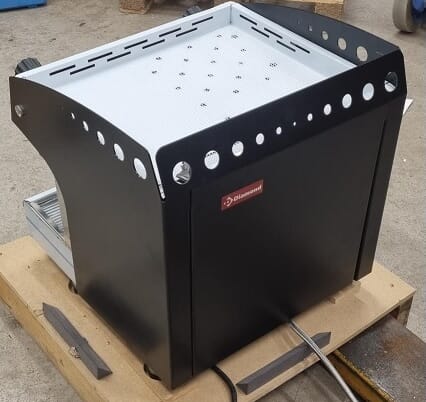 Semi-automatisk espressomaskin produsert i rustfritt og lakkert stål.