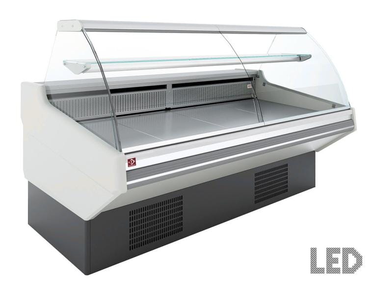 curved folding front window. Stainless steel display unit, 706mm deep. Anodised aluminium top shelf.