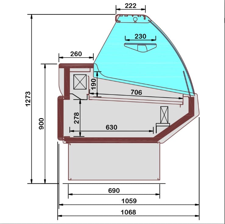 Glassene i herdet glass, buet frontvindu som kan åpenes fremover ved rengjøring. Utstillingarealet i rustfritt stål, med 706 mm dyp.