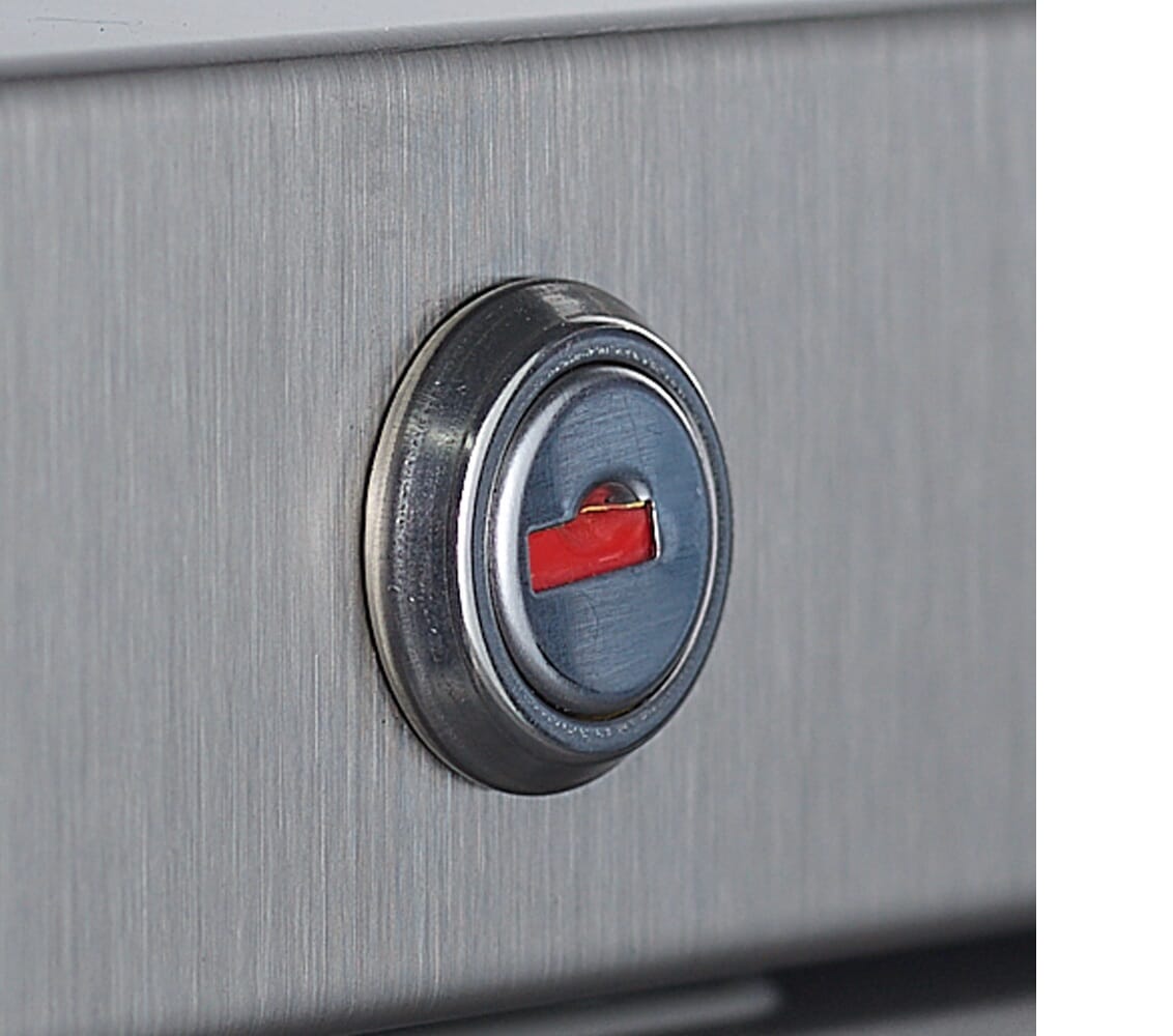 Dørlukking med automatisk tilbakekalling (låsing ved 90°). Mikrobryter som lar fordamperviften stoppe når døren er åpen. Nøkkellås som standard.