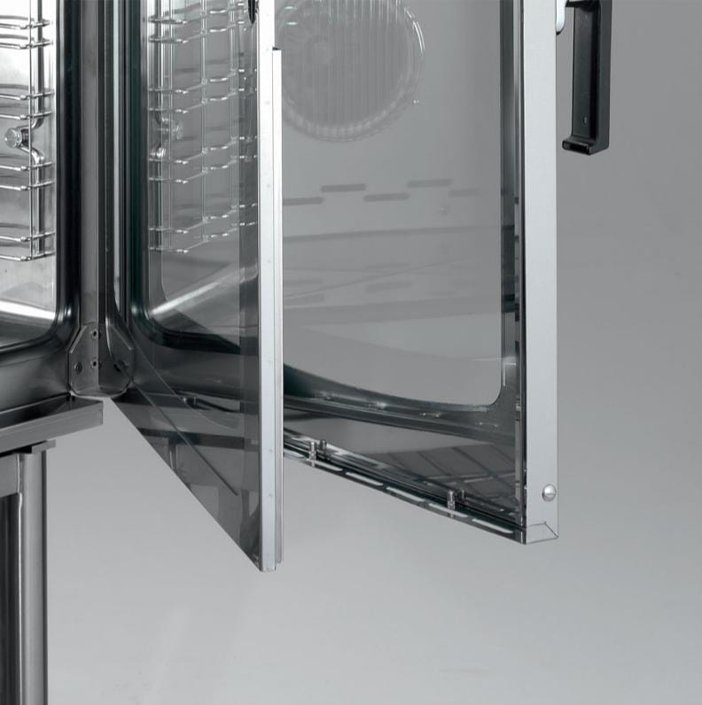 koblet direkte til utløpet. Dør med doble glass (Døren kan om-hengsles til høyre), innvendig vindu på hengsler, ergonomisk og termisk håndtak, automatisk lukking, (avtakbar) dørpakning.