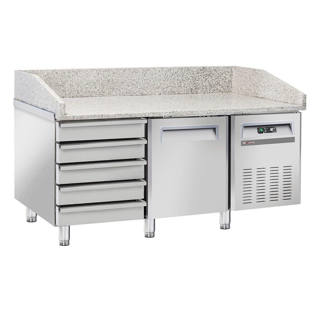 Pizzakjølebenk med 1 kjølt dør og 5 nøytrale skuffer. Tilpasset 40x60cm brett/bakker euronorm. Miljøvennlig kjølemedium R290.