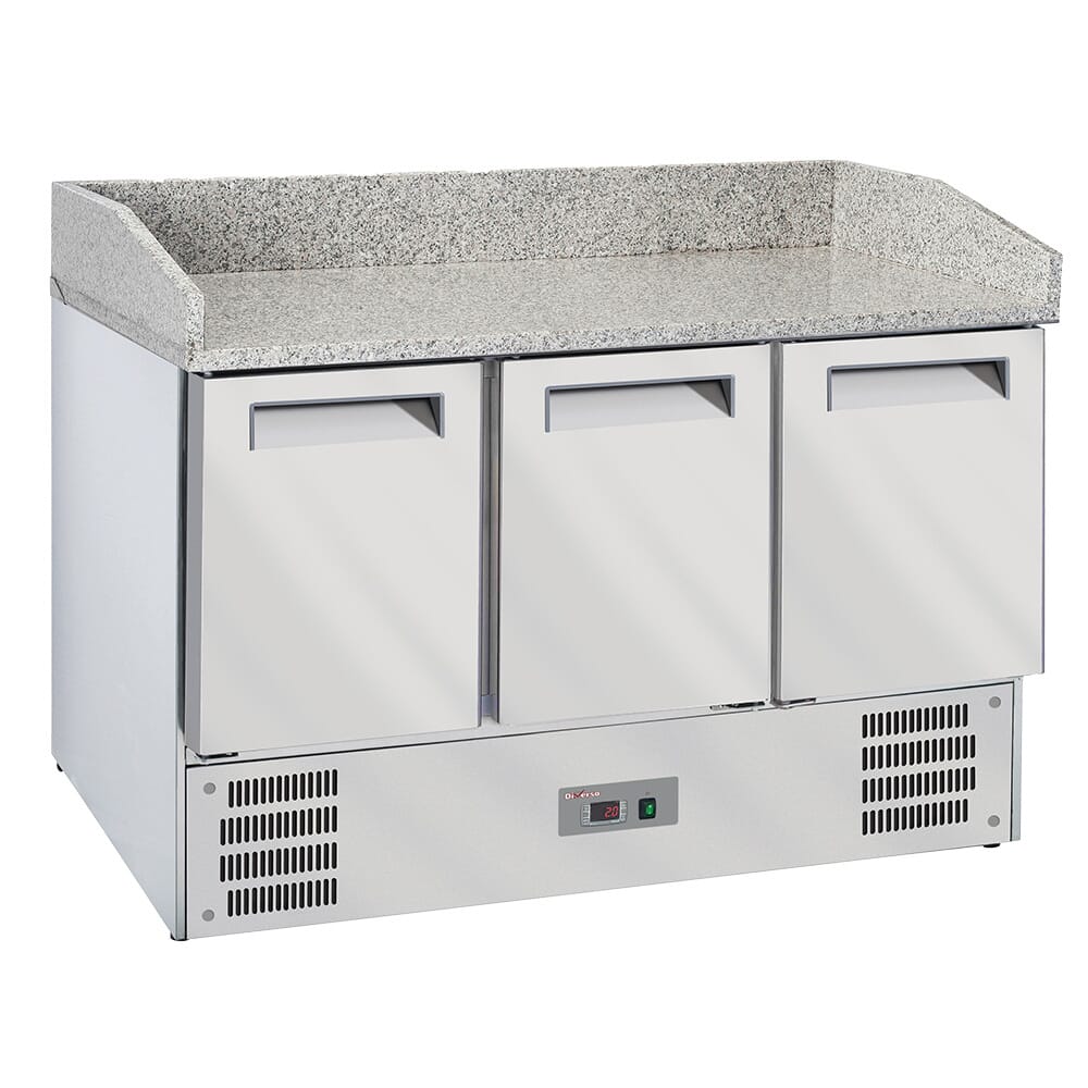 Pizzakjølebenk med 3 dører og granittopp. Tilpasset 1/1GN brett/kantiner. Miljøvennlig kjølemedium R290.