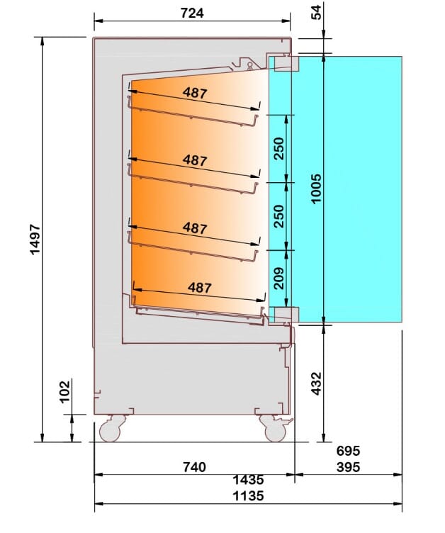 Ventilert varme via av/på-bryter, homogen temperatur. Topp LED-belysning med bryter. Justerbare hyller i rustfritt stål AISI 304 (487 mm) skrånende 9°.