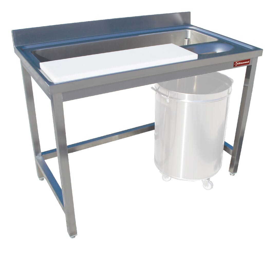 Rustfri forberedning benk for kjøtt og fisk, avfallshull mot høyre.