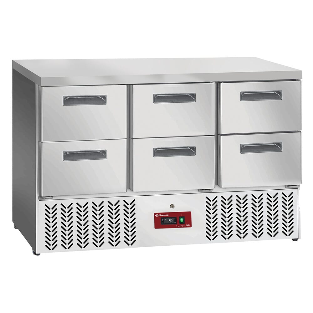 Kjølebenk med 6 skuffer. 1/1 GN-tilpasset. Mål: 1365x700x880mm.