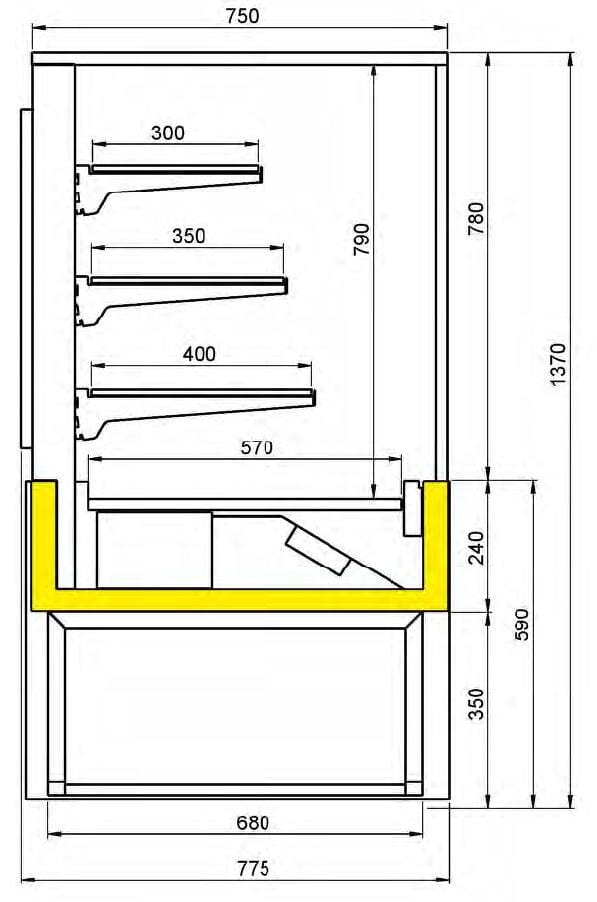 Utstilling i rustfritt stål (AISI 304), dybde i utstilling 570 mm, høyde 790 mm.