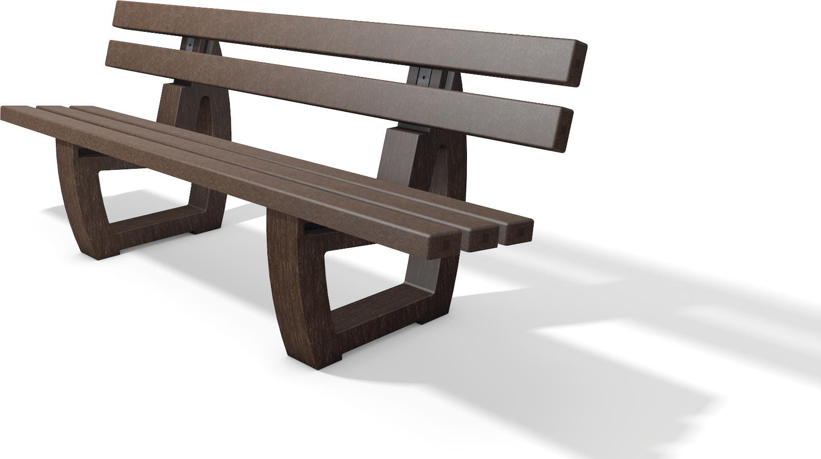 Parkbenk i resirkulert plast med innebygde stålprofiler. Kan også forankres. Med rygg.