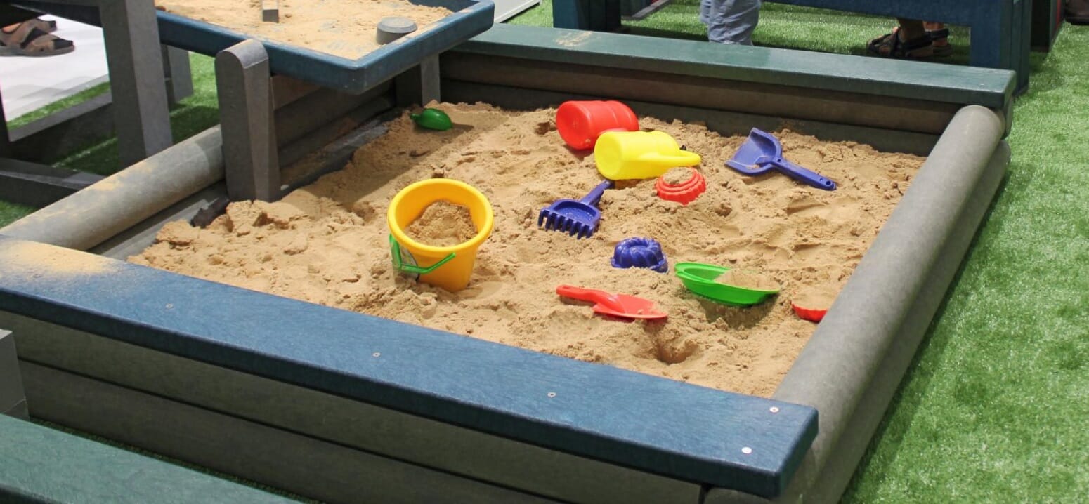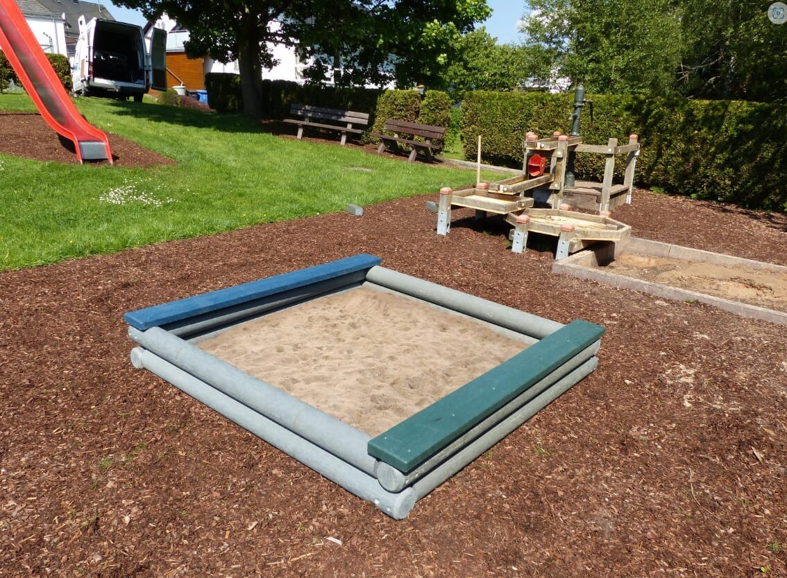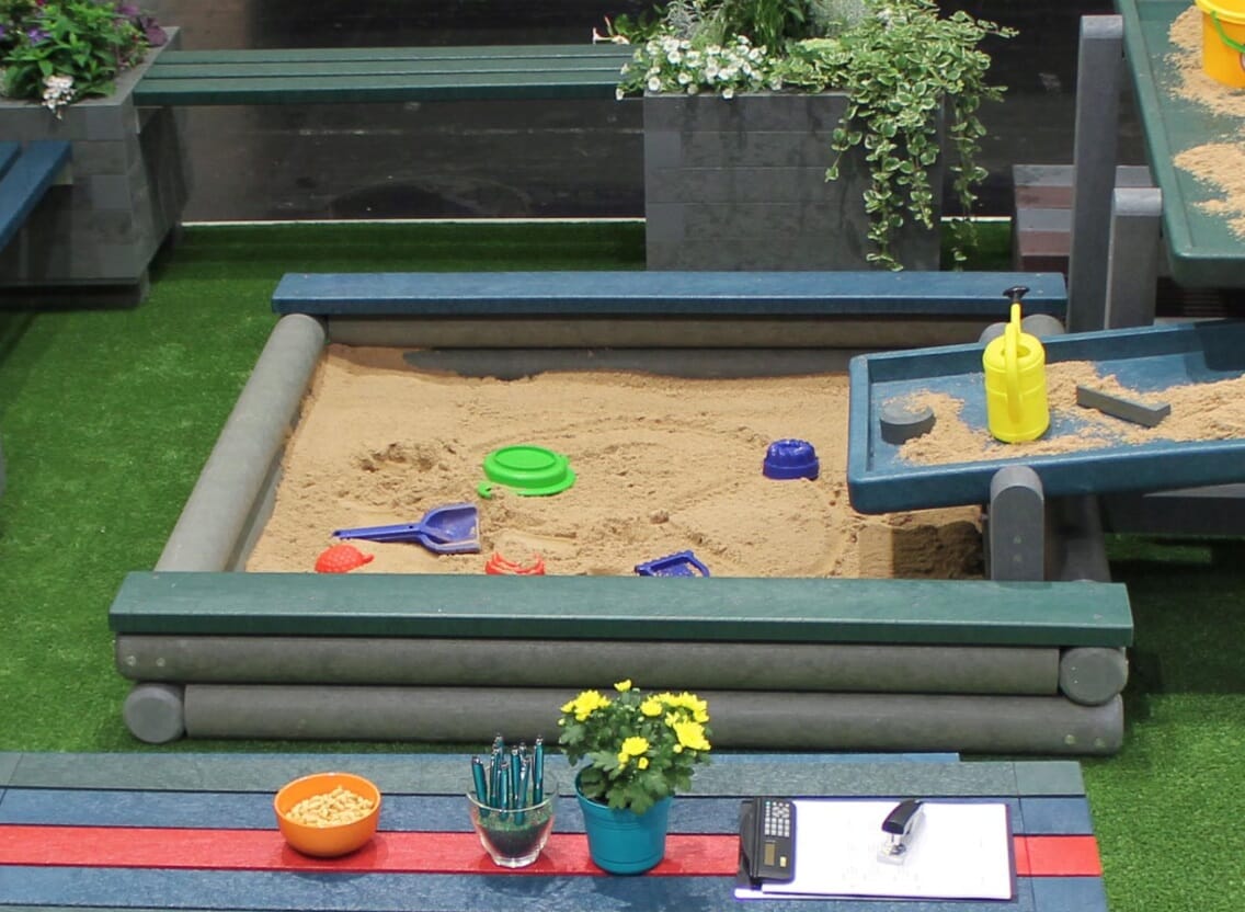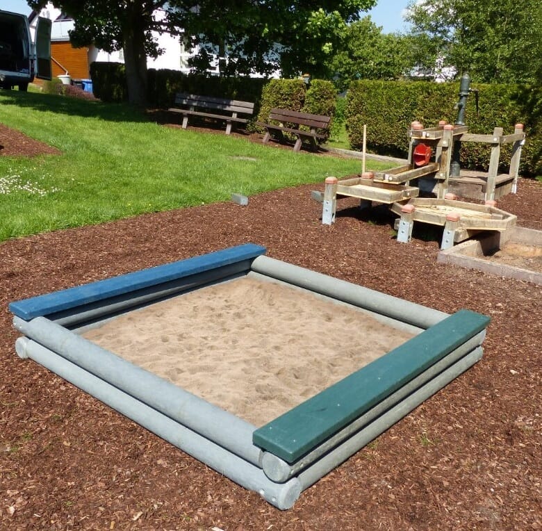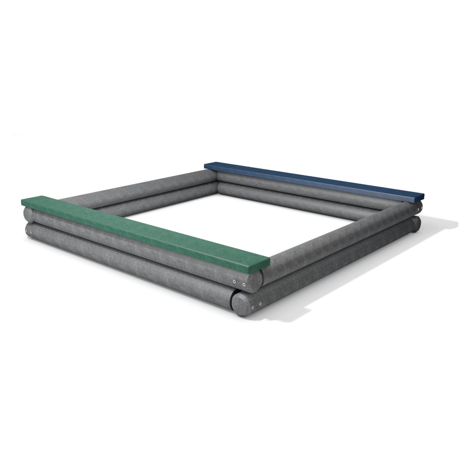 Sandkasse i vedlikeholdsfri, resirulert plast. 200x200xh28 cm.