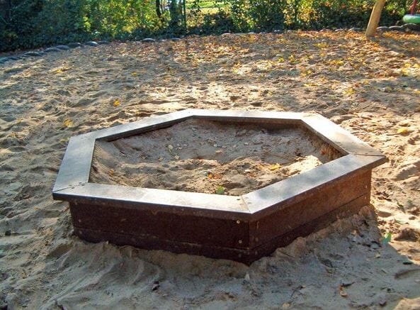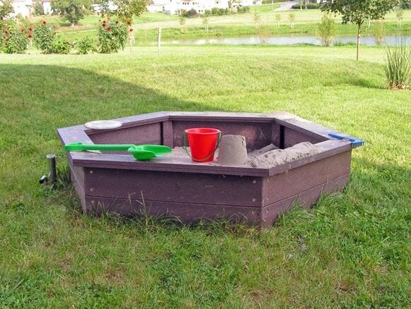 Sekskantet sandkasse utført i resirkulert plast.